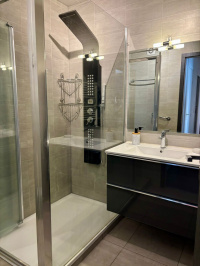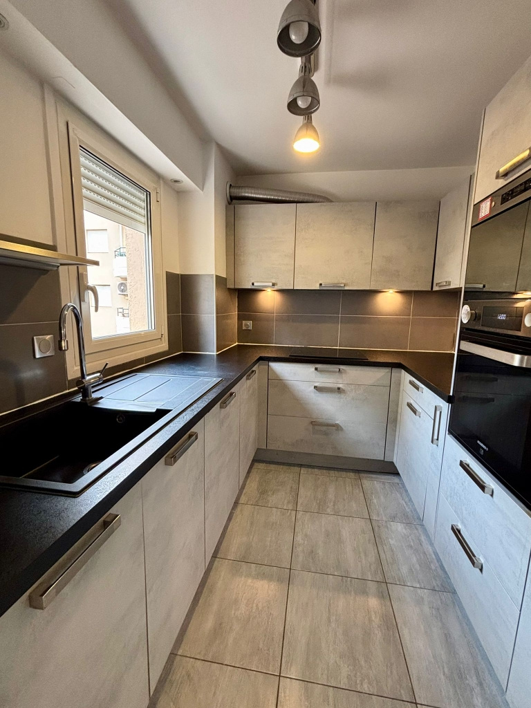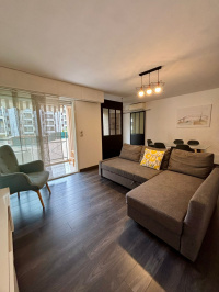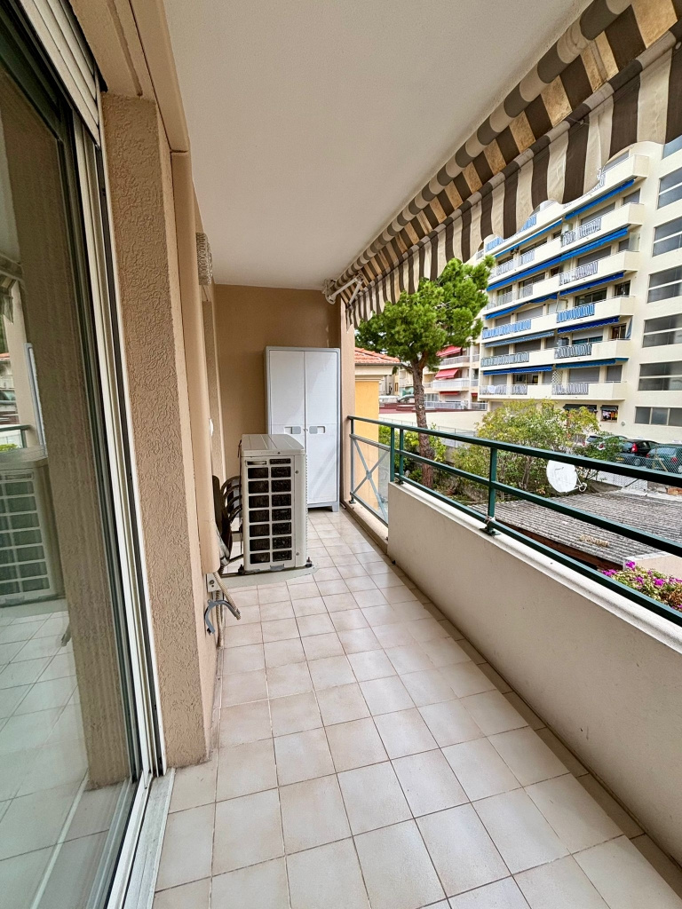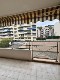 JUAN LES PINS CENTRE, A LOUER MEUBLEE A L'ANNEE, Grand 2 pièces de 54 m² donnant sur une belle terrasse au calme, belles prestations, cuisine équipée, climatisation réversible, immeuble de standing à proximité immédiate de la mer et du centre ville. Cave et garage sous-sol. Loyer charges comprises: 1 250 €